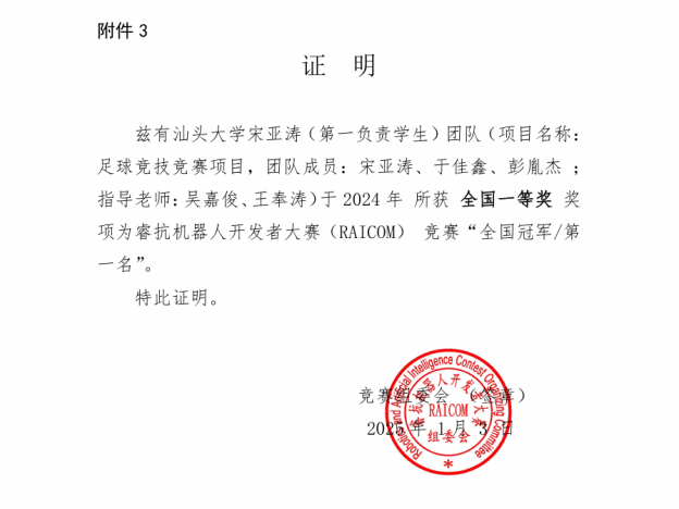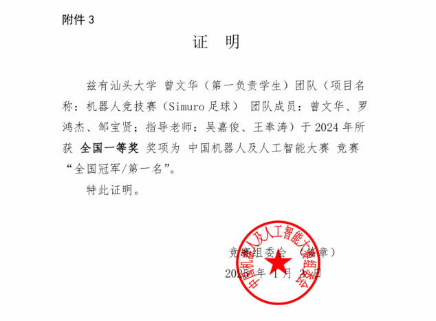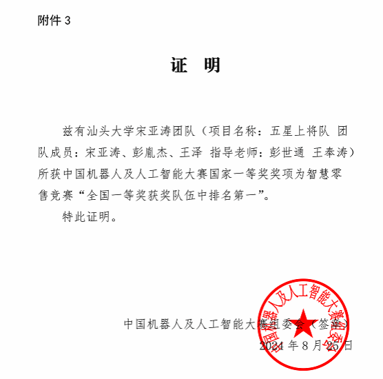 I am honored to have won the national first prize in the 26th China Robot and Artificial Intelligence Competition. Here, I would like to express my special thanks to my supervisor and every classmate in the team—it is your support and cooperation that have given me the opportunity to move forward continuously on this road. Every small progress we make is inseparable from everyone's joint efforts and dedication.