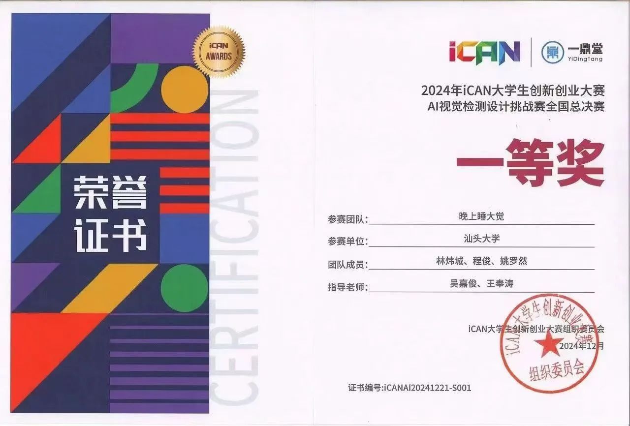 I am very honored to have won the national first prize in the AI Visual Inspection Design Challenge of the 2024 iCAN University Student Innovation and Entrepreneurship Competition, and I would like to thank the college for providing such a platform to show myself. This achievement is the result of my teammates and I working day and night under the guidance of teachers. During the preparation, we encountered many difficulties and the time was very tight, but in the end we found ways to overcome these difficulties and showed our best performance in the competition. What I want to say to my juniors and sisters is: participating in competitions will be tiring, and success does not come overnight—it is a long and arduous journey. I hope everyone can seize every opportunity to exercise themselves and bravely face the unknown.