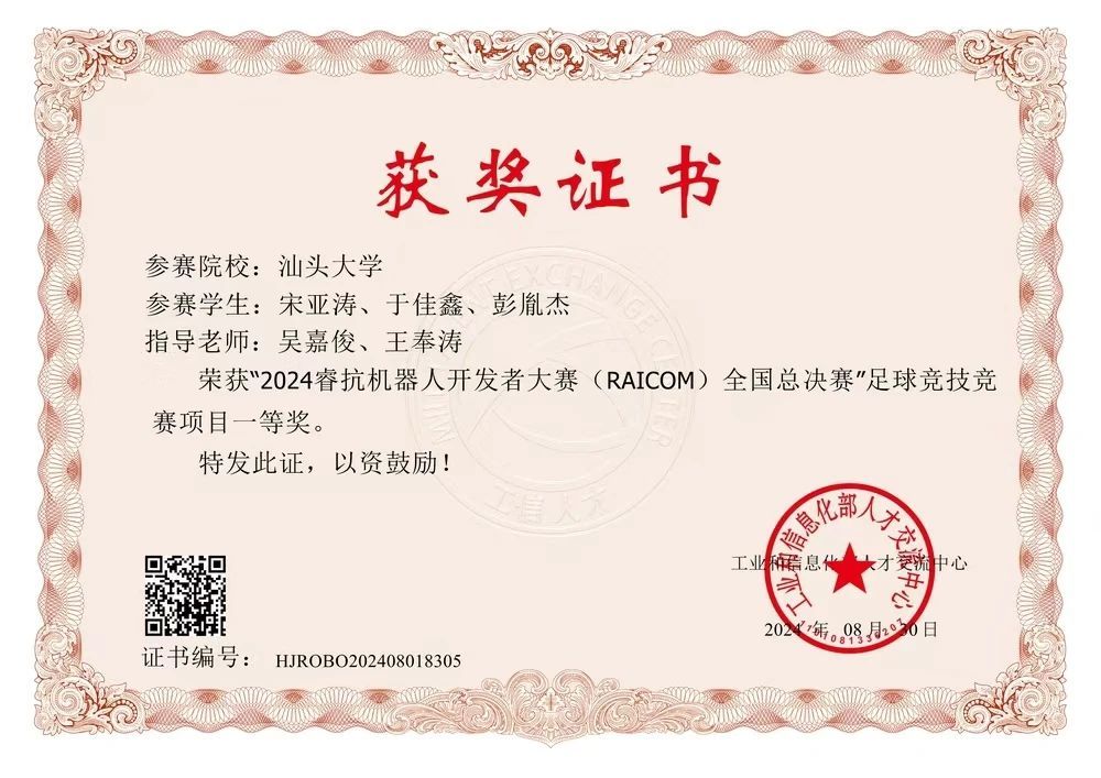 I am extremely excited and full of pride to have won the national first prize in the Robot Competition (Simuro Football) this time. The preparation process was full of challenges. At first, facing complex robot systems and programming problems, I was at a loss and didn't know where to start. With the patient guidance of teachers and senior brothers, I sorted out my ideas and gradually found the direction. In teamwork, everyone performed their own duties and cooperated tacitly. When encountering technical problems, we worked together, thought collectively and tried various solutions. This process made me deeply realize the power of the team—with joint efforts, there are no insurmountable difficulties. The tense atmosphere during the competition also tempered my adaptability, allowing me to stay calm under pressure and adjust strategies quickly. This honor is not only an affirmation of my personal efforts, but also the best interpretation of our team spirit, making me understand that unity can create infinite possibilities.