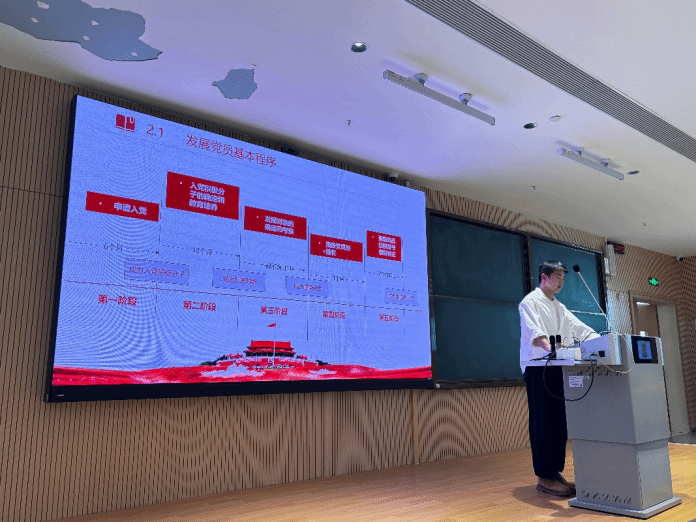 活动伊始,张智辉同志为新生们带来了干货满满的“入党导航·流程与政策一课通”。他以严谨且清晰的表达,系统梳理了从“提交入党申请书→入党积极分子→发展对象→中共预备党员→中共党员”的全流程。每一个阶段都进行了细致入微的讲解,不仅明确了各个阶段的时间节点,还详细列出了所需的材料清单,让同学们对入党的复杂流程有了清晰而全面的认识,如同为他们在追求入党的道路上绘制了一幅精准的地图。