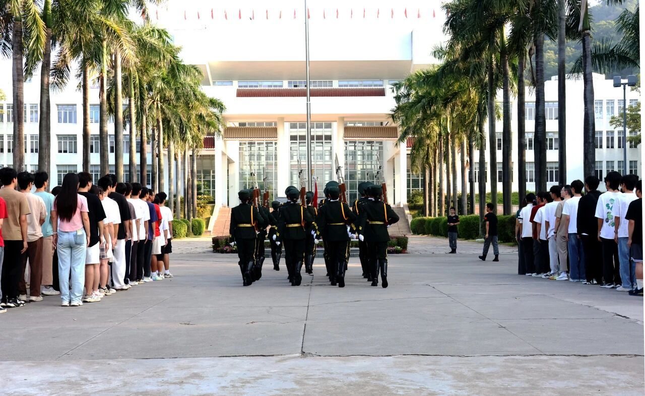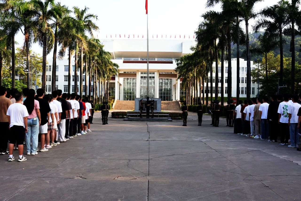 在整齐庄重的队列中,国旗被护送至旗杆前。《义勇军进行曲》奏响,师生肃立,面向国旗行注目礼、齐唱国歌。鲜艳的五星红旗冉冉升起,在晨风中迎光飘扬,爱国情、报国志在每一张青春的面庞上熠熠生辉。