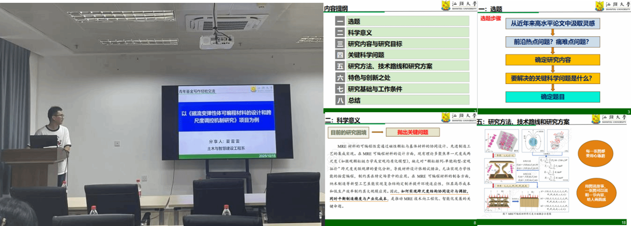 夏雷雷老师则以自身获批项目“磁流变弹性体可编程材料的设计和跨尺度调控机制研究”为案例,从选题、科学意义、研究内容等八大模块拆解申报书撰写技巧。他强调选题要贴合自身研究基础,既要关注前沿热点,也要瞄准领域痛难点,避免 “重点不明确、逻辑混乱”;阐述科学意义时,需先铺垫研究背景、点明行业困境,再清晰说明研究内容与价值;研究内容与目标要层层递进、相互呼应,关键科学问题需聚焦核心,避免混淆科学问题与工程问题。此外,夏老师特别提到技术路线图的重要性,建议通过图表 “讲故事”,确保逻辑清晰、视觉直观,同时在 “研究基础与工作条件” 部分,充分展示个人前期成果与学校实验平台优势,增强评审专家信任感。
