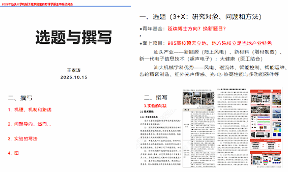 交流会上,王奉涛教授以“2026 年国基申报选题与撰写”为主题展开分享。他提出选题需遵循 “3+X” 原则,即明确研究对象、问题与方法,还需结合学科优势与地方产业特色。汕头在新能源(海上风电)、新材料(增材制造)等领域产业基础扎实,而机械学科在风电、智能控制、齿轮精密制造等方向实力突出,教师可从中挖掘选题方向。在撰写环节,王教授以“裂纹扩展机理引导的超长海上风机叶片多模态大语言模型智能健康监测”为例,详解机理、机制与路线的梳理逻辑,指出实验撰写需明确数据采集方法与验证流程,图表要直观呈现研究架构与技术路线,帮助评审专家快速把握研究核心。