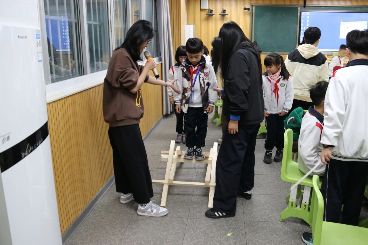 而将整个动手环节推向高潮的,是志愿者们现场搭建的一座大型“倍力桥”。该桥以多根木棍交错搭建而成,结构稳固、造型美观,充分展现出桁架结构特有的力学之美。在志愿者的引导和保护下,小学生们依次走上桥面,亲身感受桥梁在承重时的稳定与坚固。站上自己所学过的桥梁结构,孩子们既兴奋又专注,直观理解了桥梁如何通过合理的结构分布荷载、保障安全。此次活动不仅锻炼了他们的动手能力与协作意识,更让桥梁设计的智慧,在孩子们心中埋下了实践的种子。
