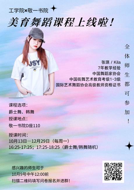 为增进师生之间的交流,丰富校园文化生活,提升艺术修养与审美情趣,营造积极向上、朝气蓬勃的文化氛围,工学院、敬一书院决定开展首届从游节之“舞限律动”体验课程。具体通知如下: