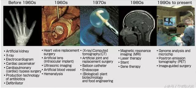 要畅想未来,就必须了解历史。2006年,AIMBE(美国医学与生物工程院)评选出了上世纪生物医学工程对人类医学事业最具有价值的医疗技术与设备,以十年为一个阶段,如下图。