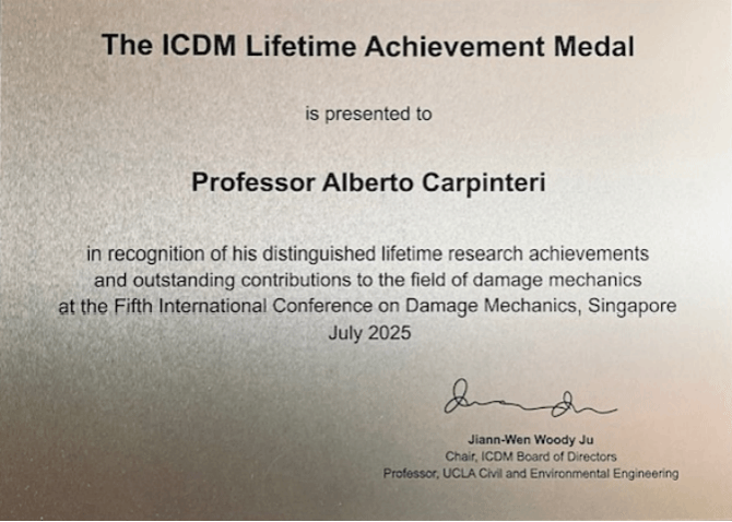 2025年7月17日,第五届国际损伤力学国际会议(ICDM)在新加坡举行,我校工学院教师Alberto Carpinteri教授被授予“国际损伤力学终身成就奖”,以表彰其在该领域作出的奠基性与持续性的卓越贡献。该奖项由大会主席、加州大学洛杉矶分校Jiann-Wen Woody Ju教授亲自颁发,是国际损伤力学领域的最高学术荣誉之一。