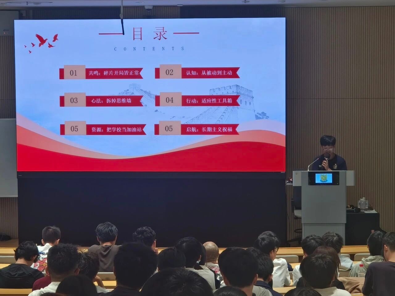 中共预备党员张泽键,从自身经历出发,分享了如何重建生活秩序、搭建支持系统,实现从适应到掌控的心态转变。用 “仅13 天课堂悬浮感” 、“被动到主动”感受介绍,拉近与新生的距离 。他提出 “问题 = 待开发能力” 的认知转变方法,帮助新生快速适应大学生活,找到属于自己的节奏。