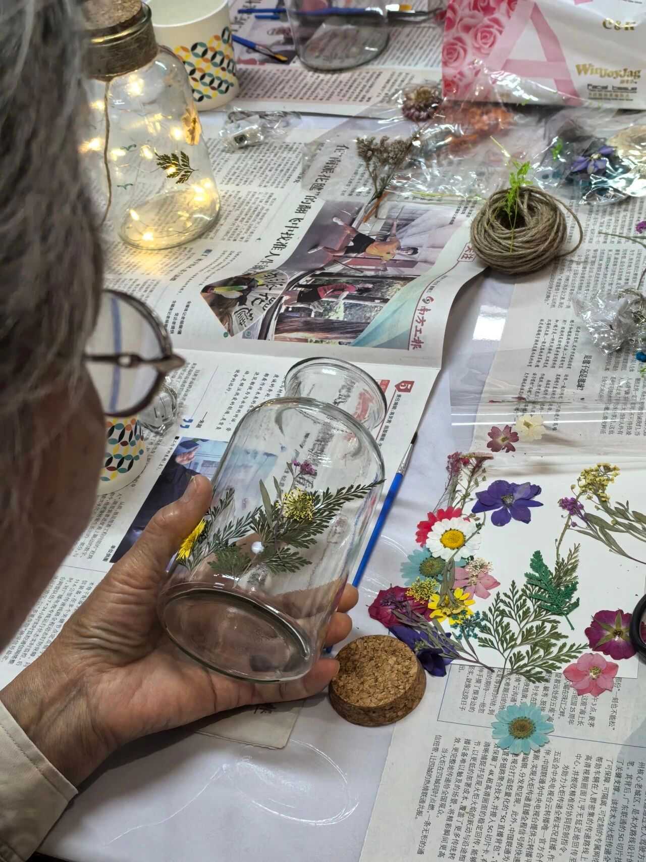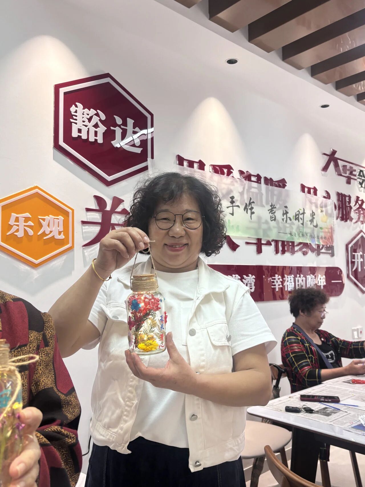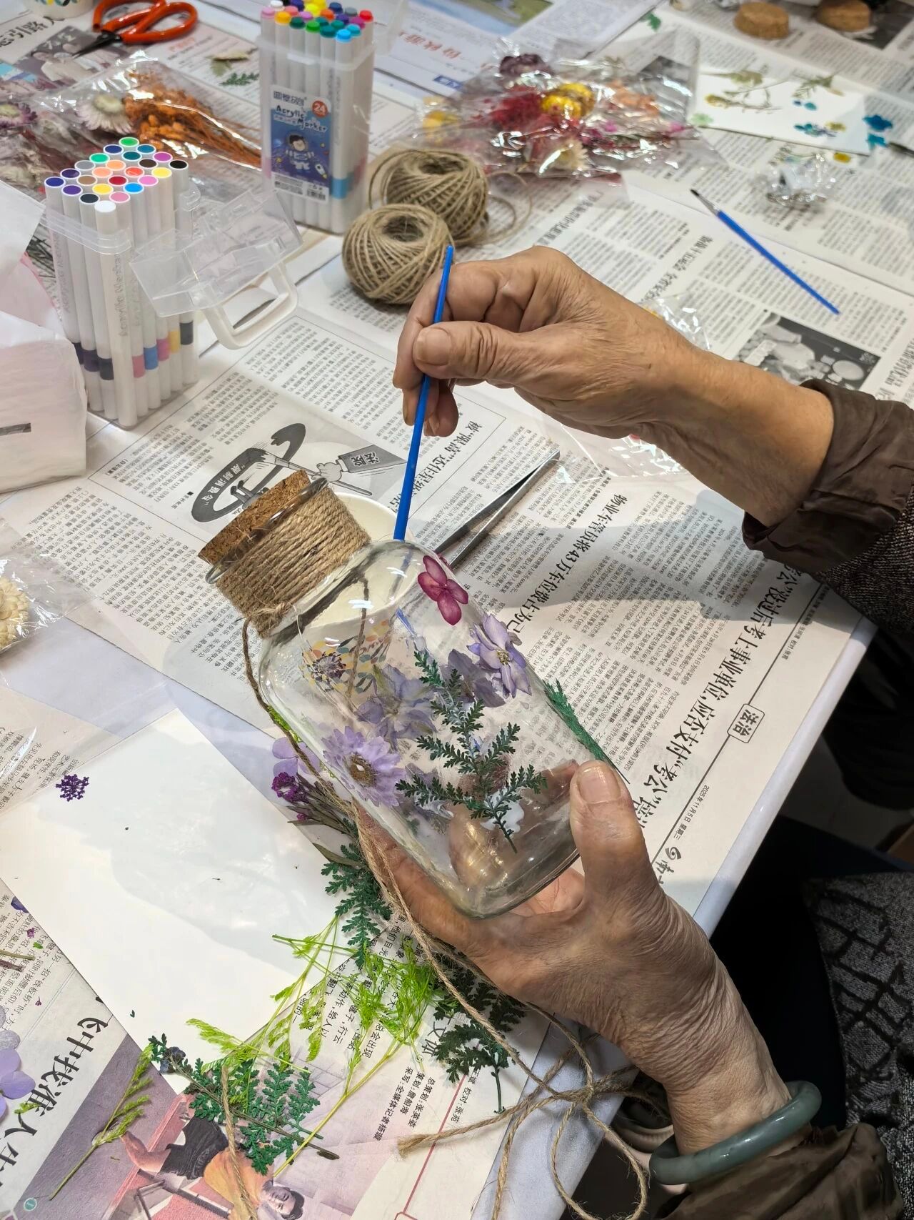 展示交流环节,现场成了一片流动的“光影美学小天地”——老人们纷纷按下瓶底开关,暖黄或柔和的光线从瓶身透出,干花的纹理在光影中愈发清晰,有的像摇曳的花影,有的似细碎的星光,原本静态的作品瞬间有了灵动气息。大家在一起,捧着自己的作品互相欣赏,不时交流创作时的巧思。