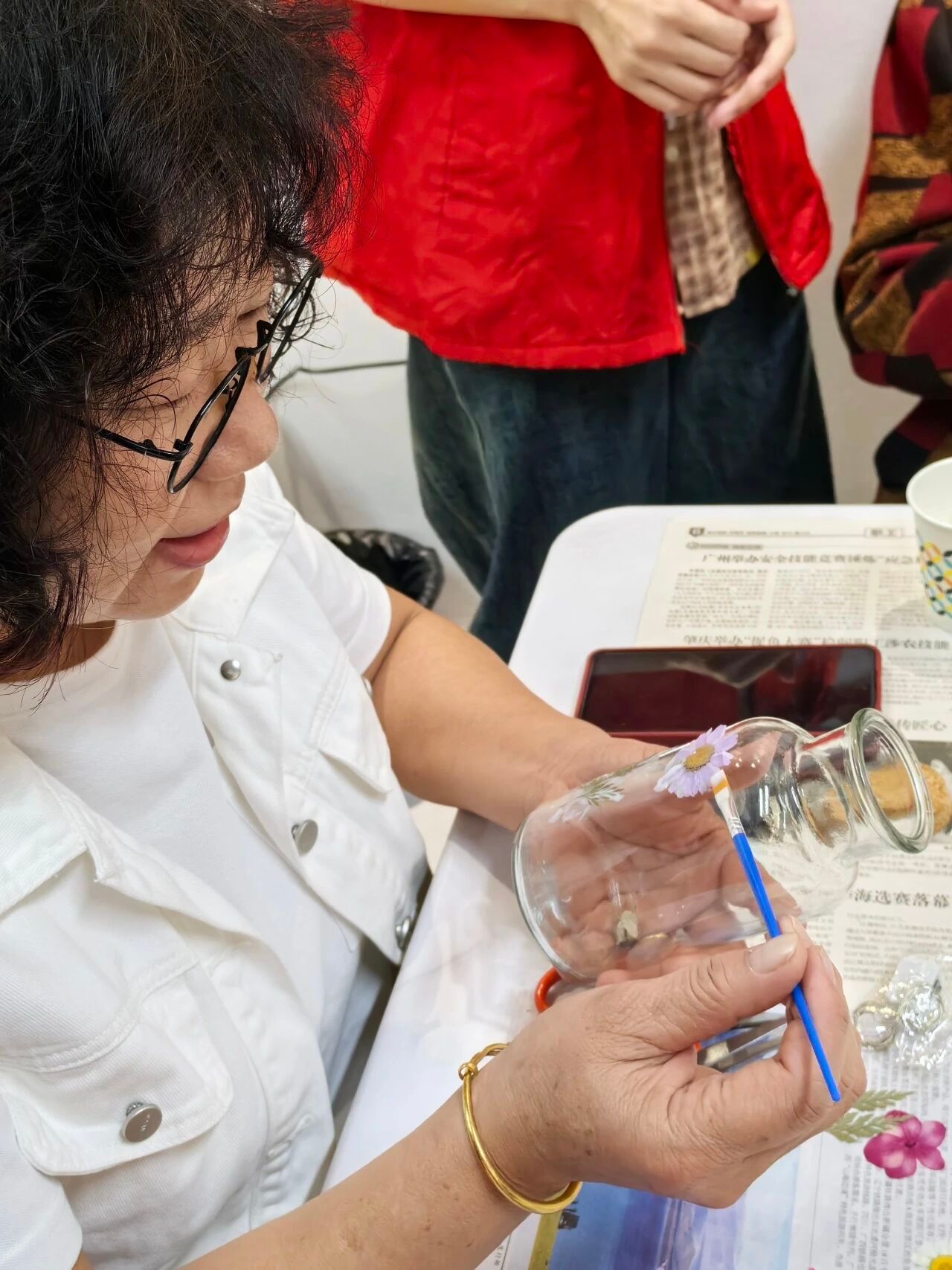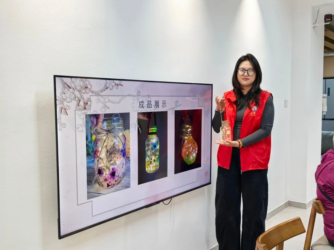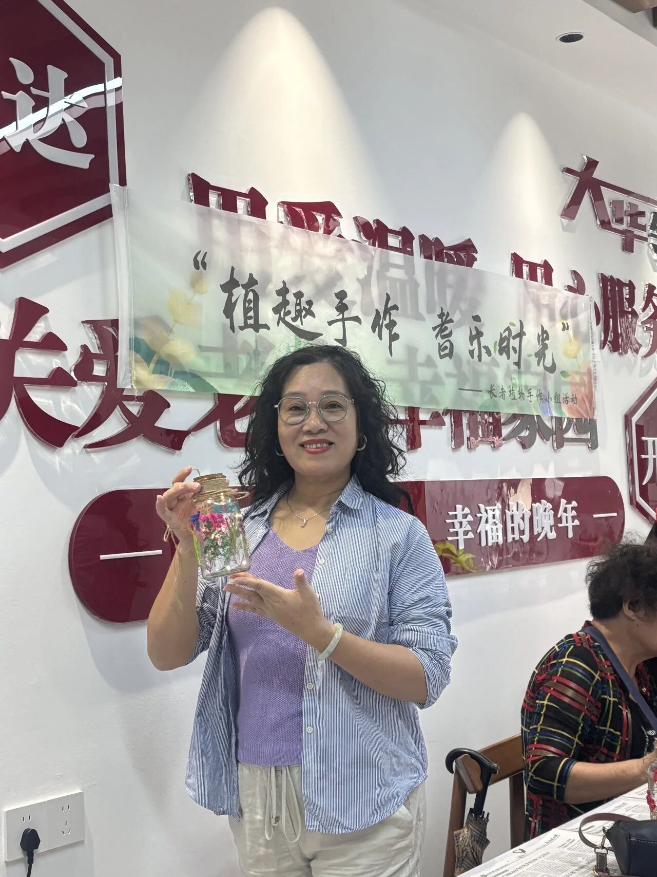 展示交流环节,现场成了一片流动的“光影美学小天地”——老人们纷纷按下瓶底开关,暖黄或柔和的光线从瓶身透出,干花的纹理在光影中愈发清晰,有的像摇曳的花影,有的似细碎的星光,原本静态的作品瞬间有了灵动气息。大家在一起,捧着自己的作品互相欣赏,不时交流创作时的巧思。