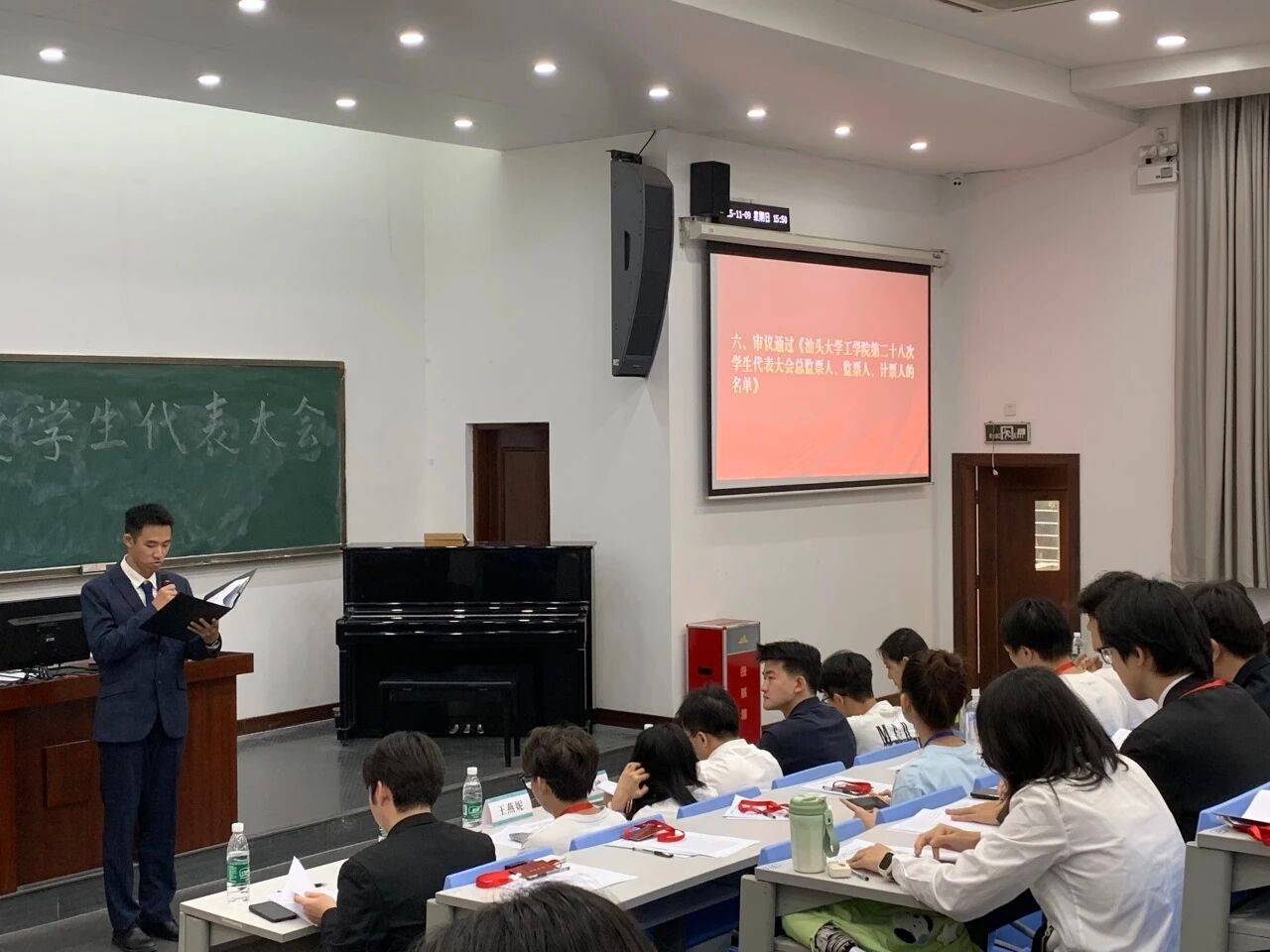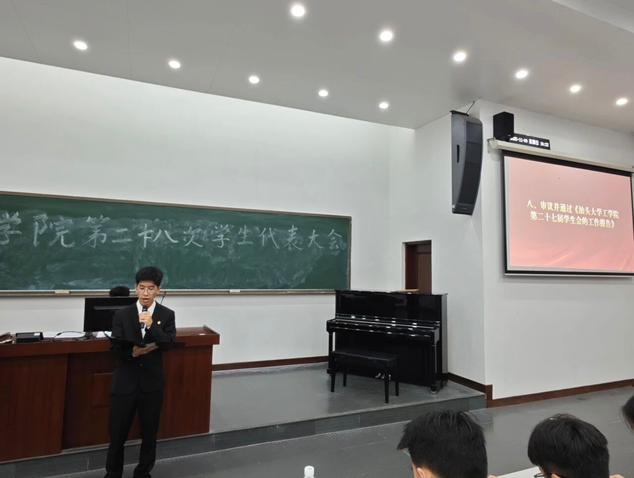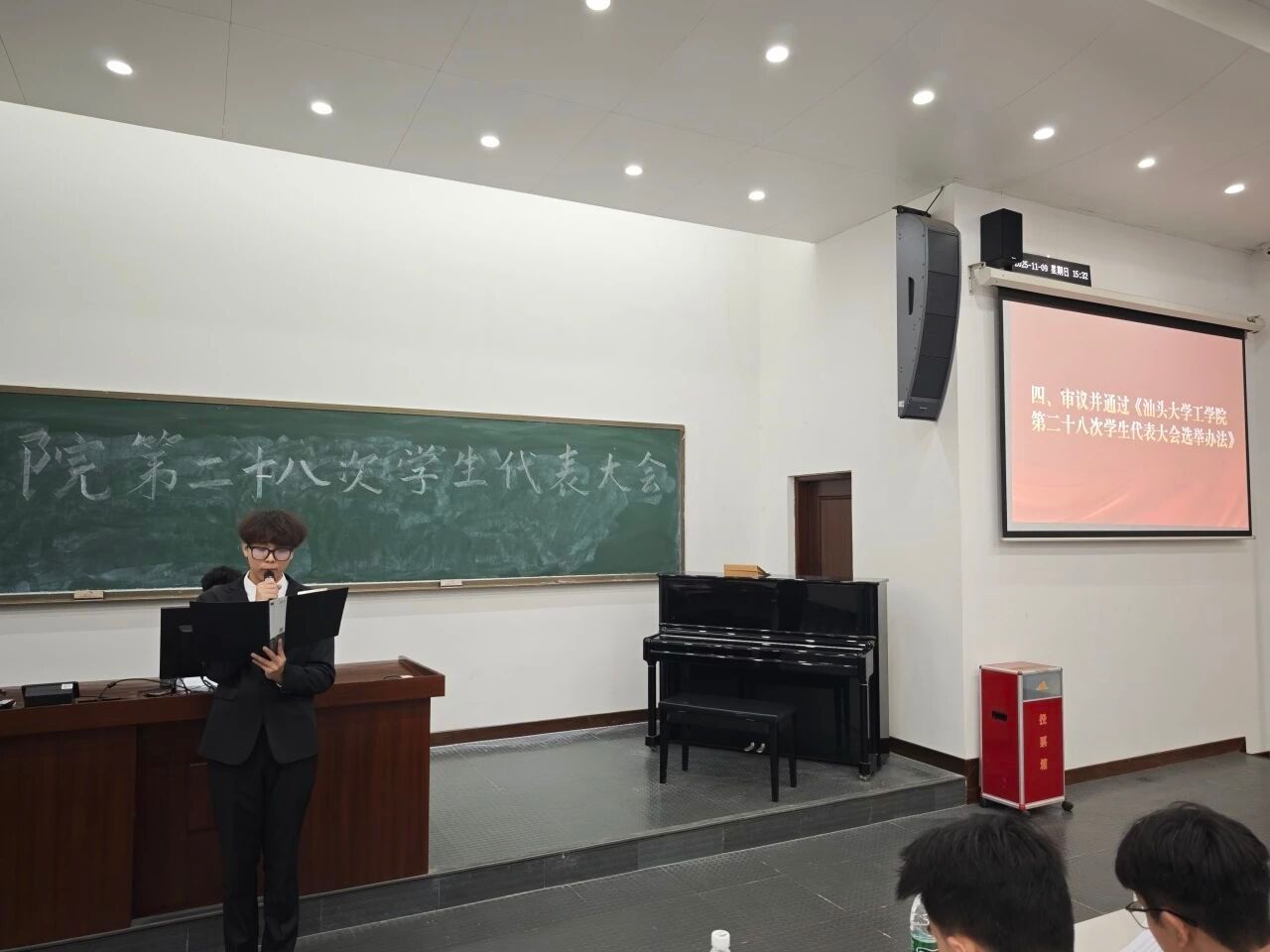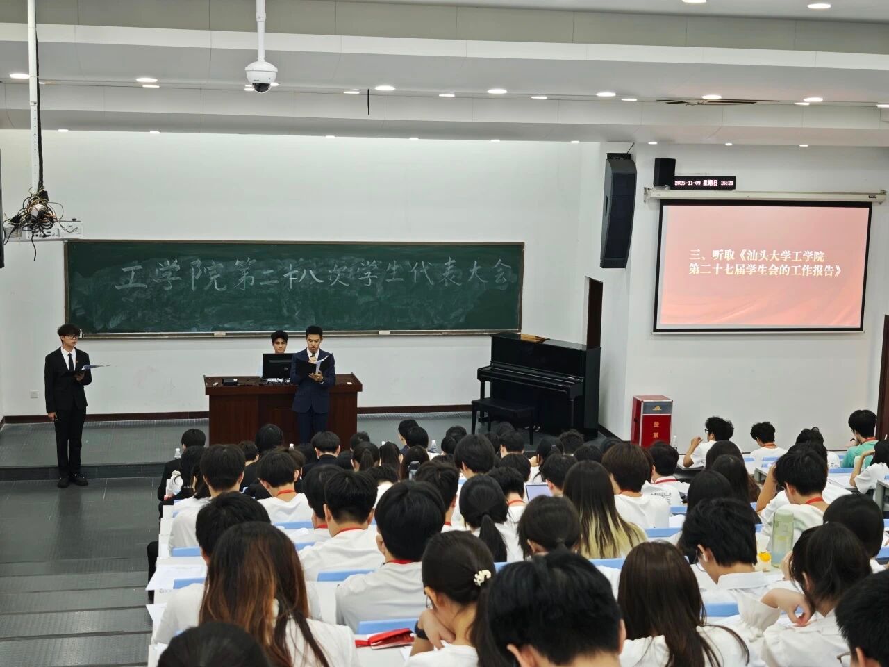 2025年11月9日,汕头大学工学院第二十八次学生代表大会在桑浦山校区讲堂一顺利召开。