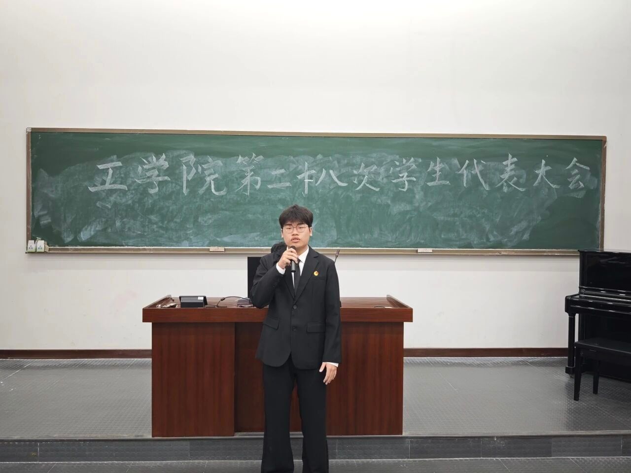 宋泰哲同学汇报了工学院第二十七届学生会工作报告,在过去一年,学生会在学院党委的领导和团委的具体指导下,围绕“五色学院”建设踔厉奋发,顺利举办体育节、科技节等系列活动。