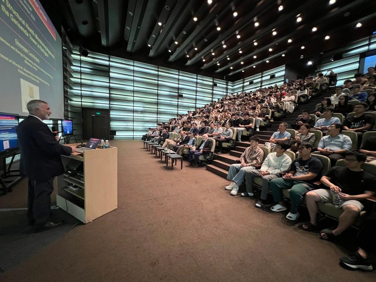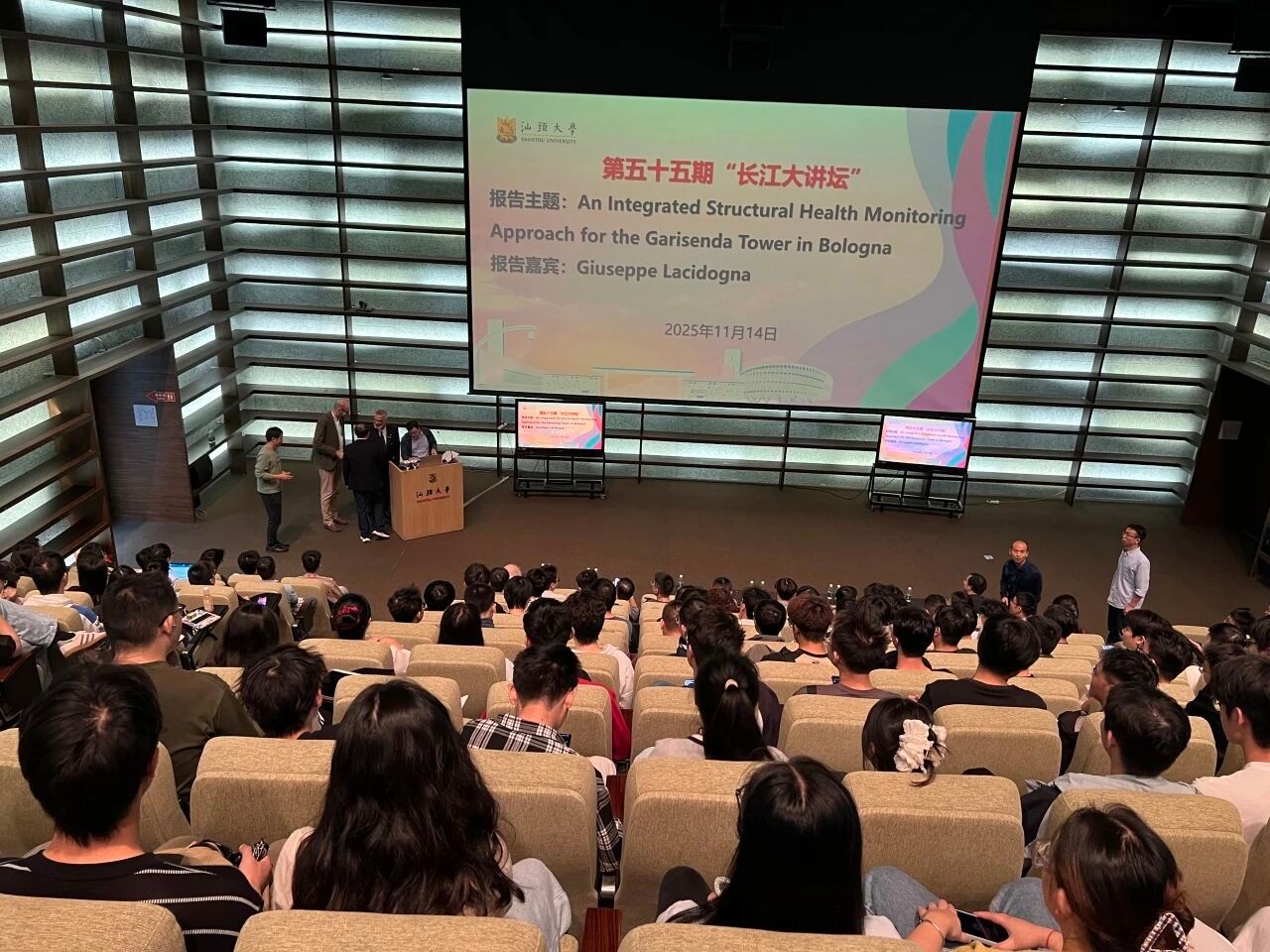 2025年11月14日下午,汕头大学党委宣传统战部和工学院联合举办的第五十五期“长江大讲坛”在图书馆报告厅举行。意大利都灵理工大学教授、欧洲科学院院士Giuseppe Lacidogna教授受邀给汕大师生作主题为“An Integrated Structural Health Monitoring Approach for the Garisenda Tower in Bologna”的学术报告。工学院院长沈水龙主持讲座。