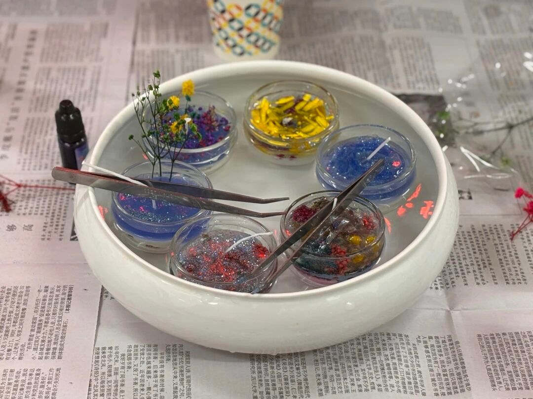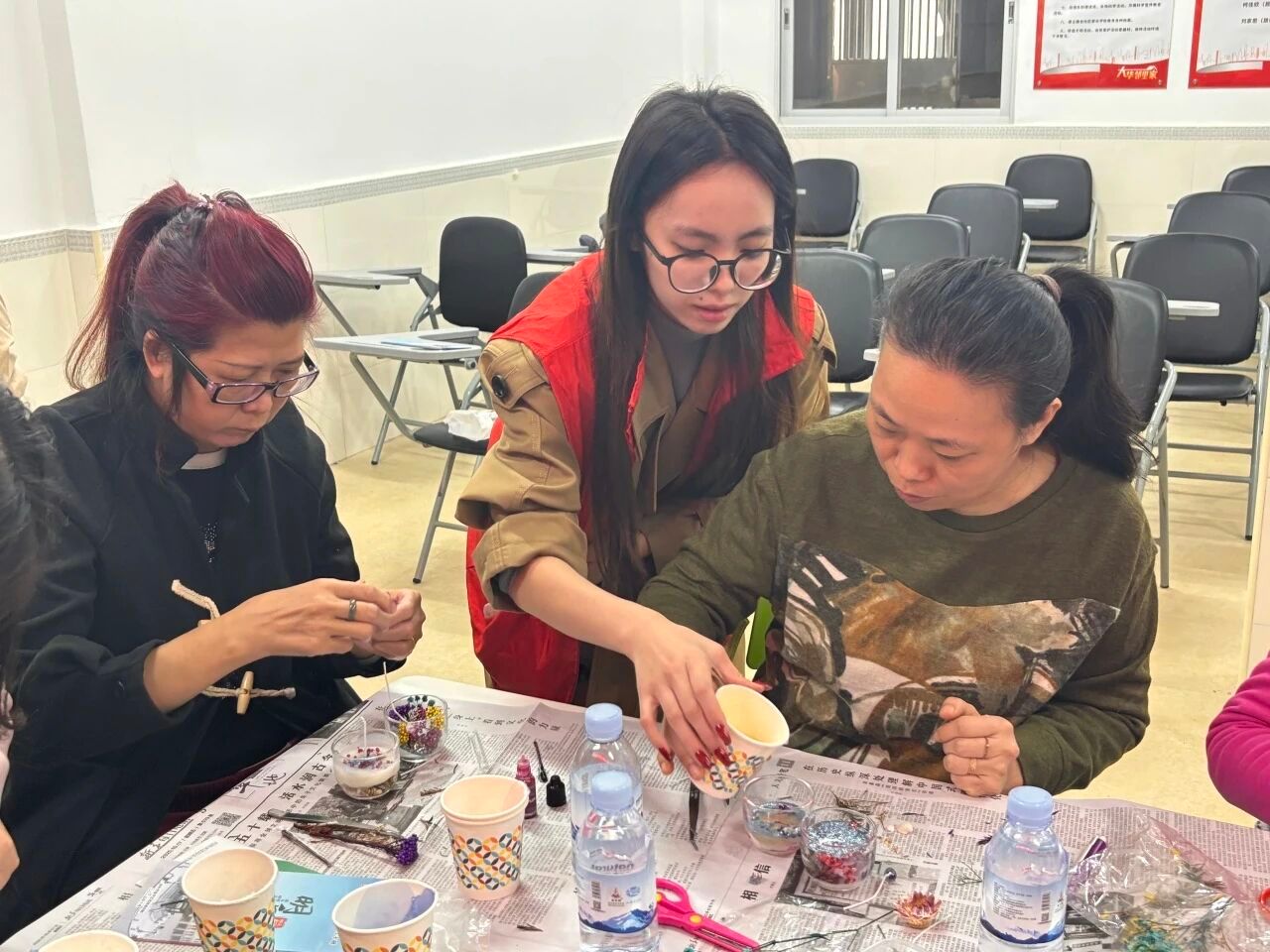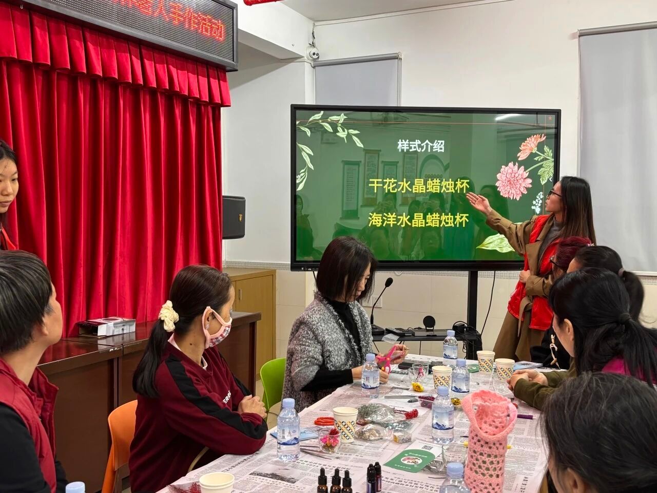 在制作示范环节,志愿者逐步演示了水晶蜡烛杯的制作流程:从融化蜡材、摆放烛芯,到点缀亮片、贝壳与碎石,每一个步骤都讲解得细致入微。老人们听得专注,不时拿起材料比对、构思。有的参照示例设计出层次分明的“海洋杯”,有的自由发挥,将彩色花草拼成心中的图案。在志愿者的协助下,大家小心翼翼地搅拌蜡液、固定装饰,原本普通的材料渐渐变成一盏盏独具匠心的水晶蜡烛杯。