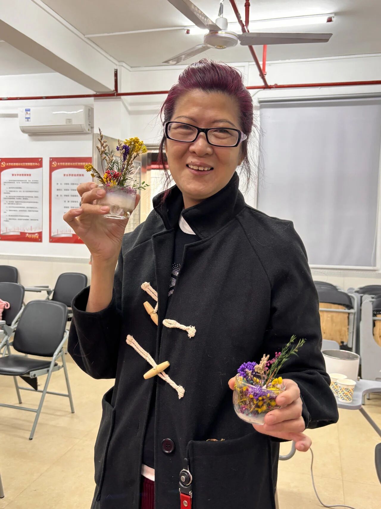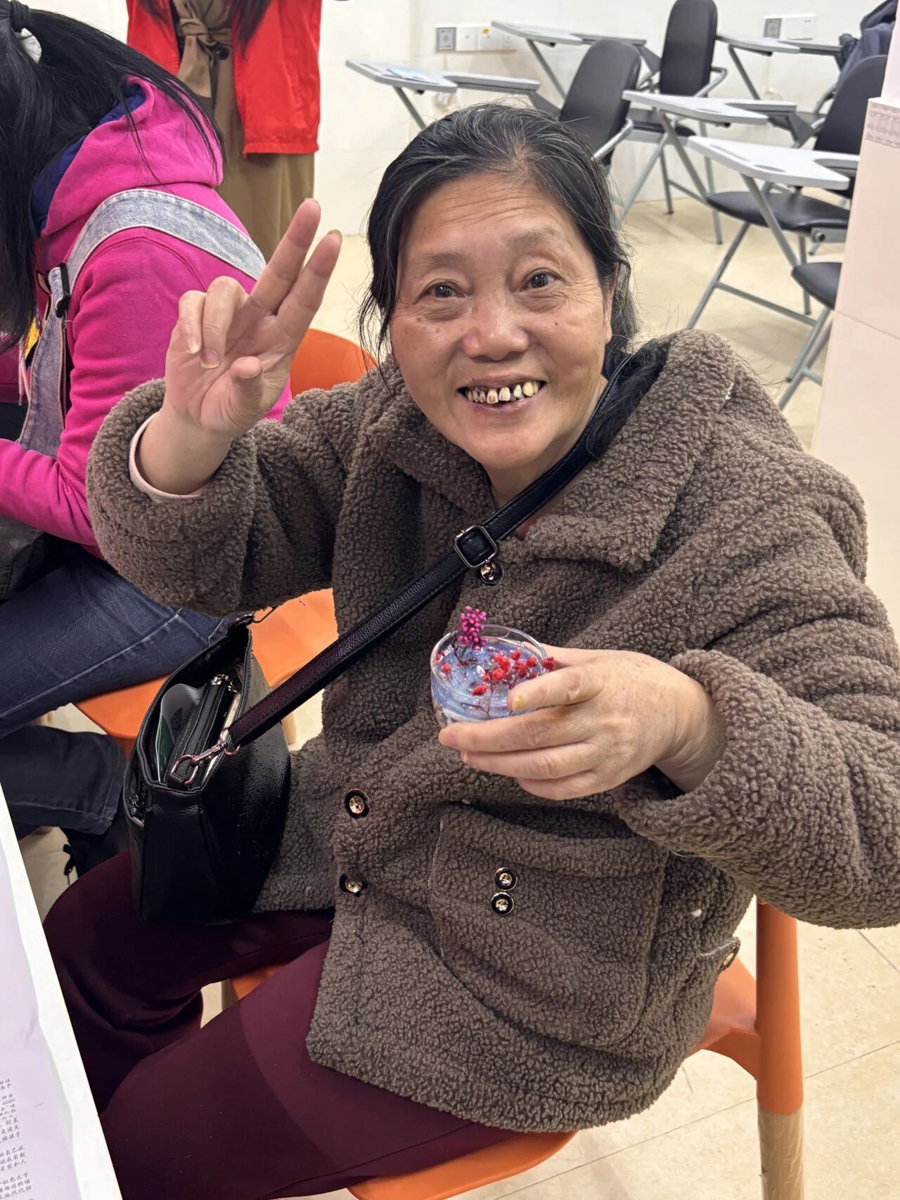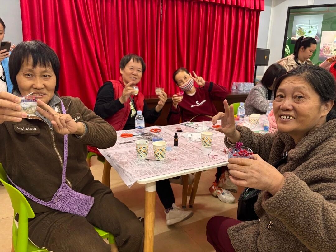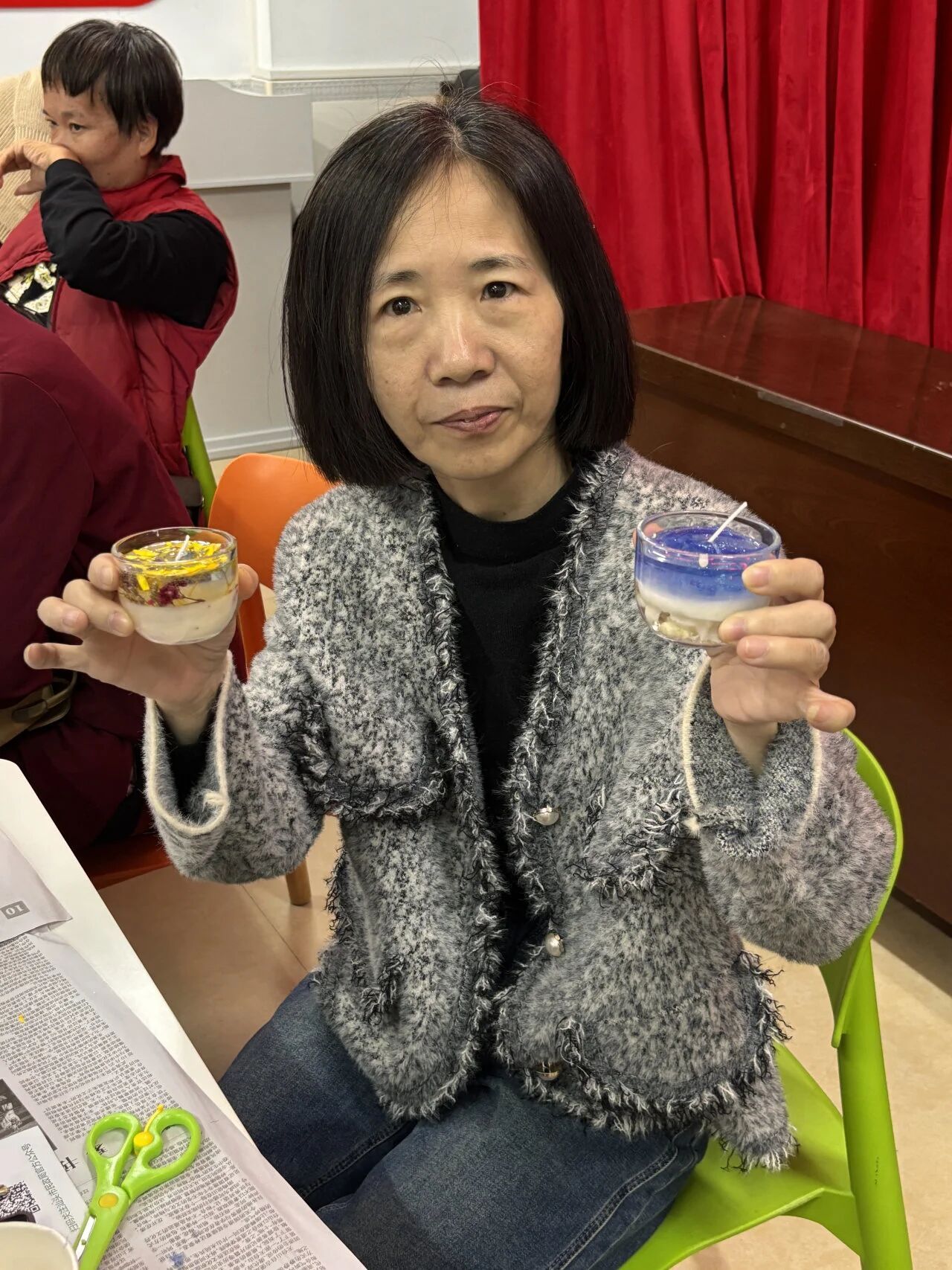 随着一盏盏晶莹温暖的水晶蜡烛杯陆续完成,活动进入了展示交流环节。老人们纷纷举起自己的作品,互相欣赏、交流灵感。有的杯子晶莹剔透如冰雪世界,有的色彩斑斓似晚霞满天。大家在欢声笑语中分享制作心得,拉近了彼此的距离,也增强了社区的凝聚力。
