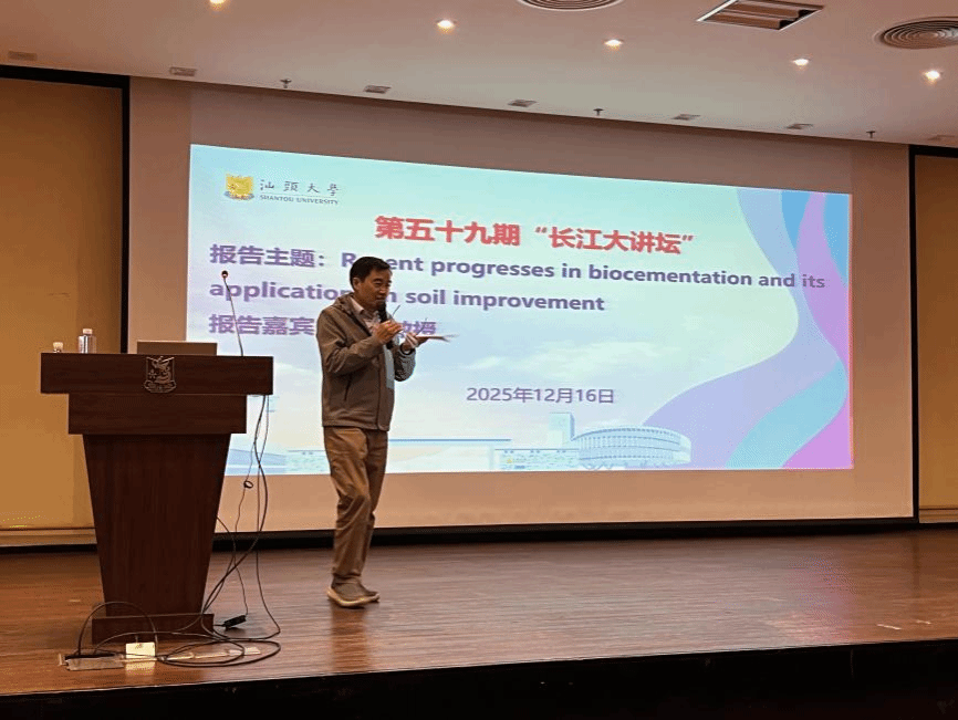 2025年12月16日下午,汕头大学党委宣传统战部和工学院联合举办的第五十九期“长江大讲坛”在科技楼报告厅举行。南洋理工大学讲席教授、新加坡工程院院士楚剑教授受邀给汕大师生作主题为“Recent progresses in biocementation and its applications in soil improvement”的学术报告。工学院院长沈水龙教授主持讲座。