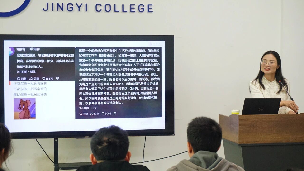 最后,蒋洋洋结合校园生活实例,帮助学生做出更务实的选择。她以汕大与其他高校食堂管理的差异为例,比较不同层级高校在资金投入等方面的差距,提醒学生在评估外部机会时要关注平台资源与成长空间,而不是仅看短期利益,鼓励大学生怀揣理想、向上兼容。在备考与面试方面,她分享了行测、申论与面试表达的实用技巧,强调逻辑清晰、事实支撑与真诚表达的重要性,提出了“广撒网、精准择优”的策略,鼓励学生探索更多发展渠道,如关注省考、选调生等高质量平台。针对广泛关注的基层服务与社会实践,她亦鼓励青年把握基层工作机会,在服务中增长才干、锤炼品格。
