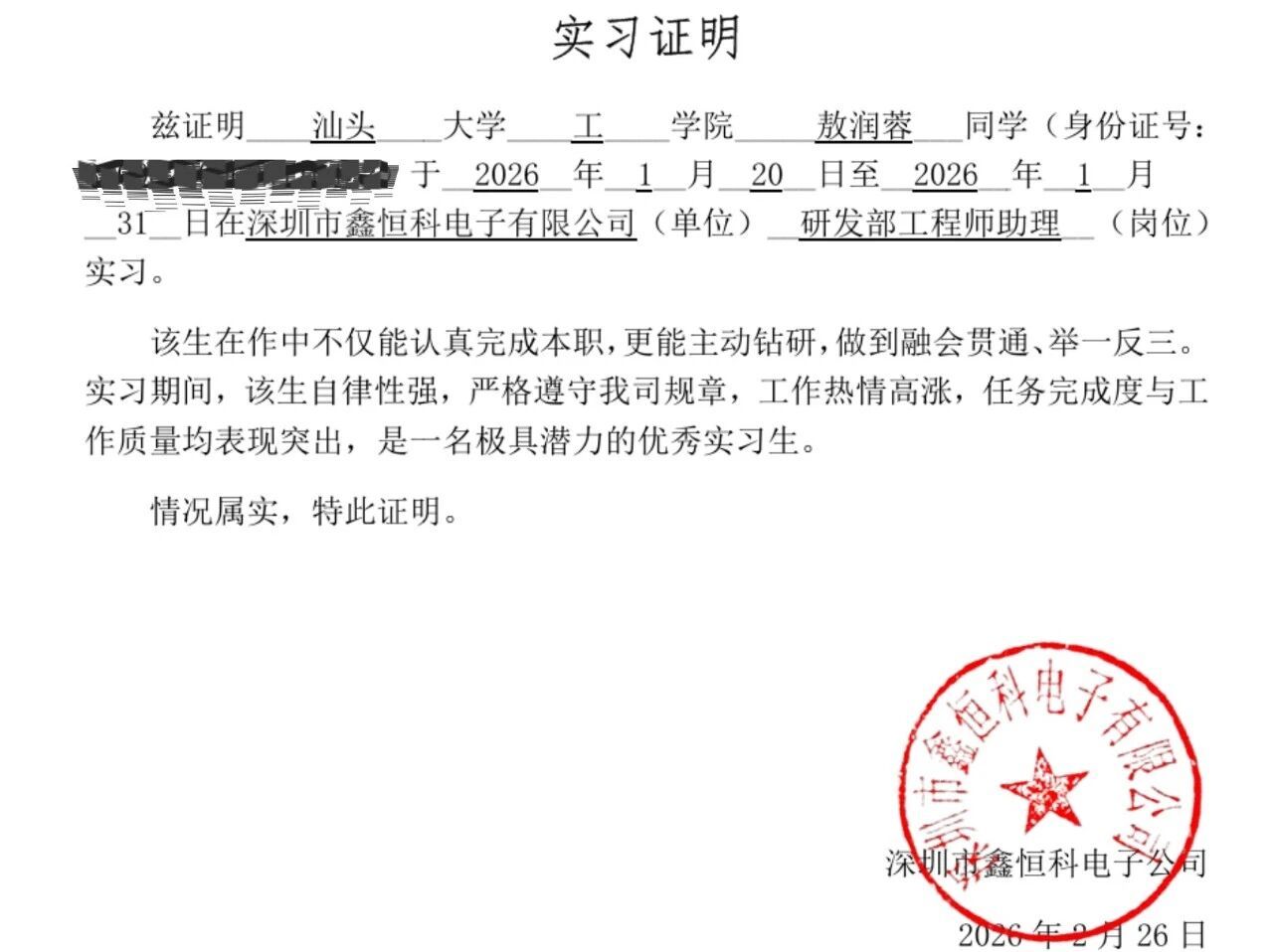 深圳市鑫恒科电子有限公司实习