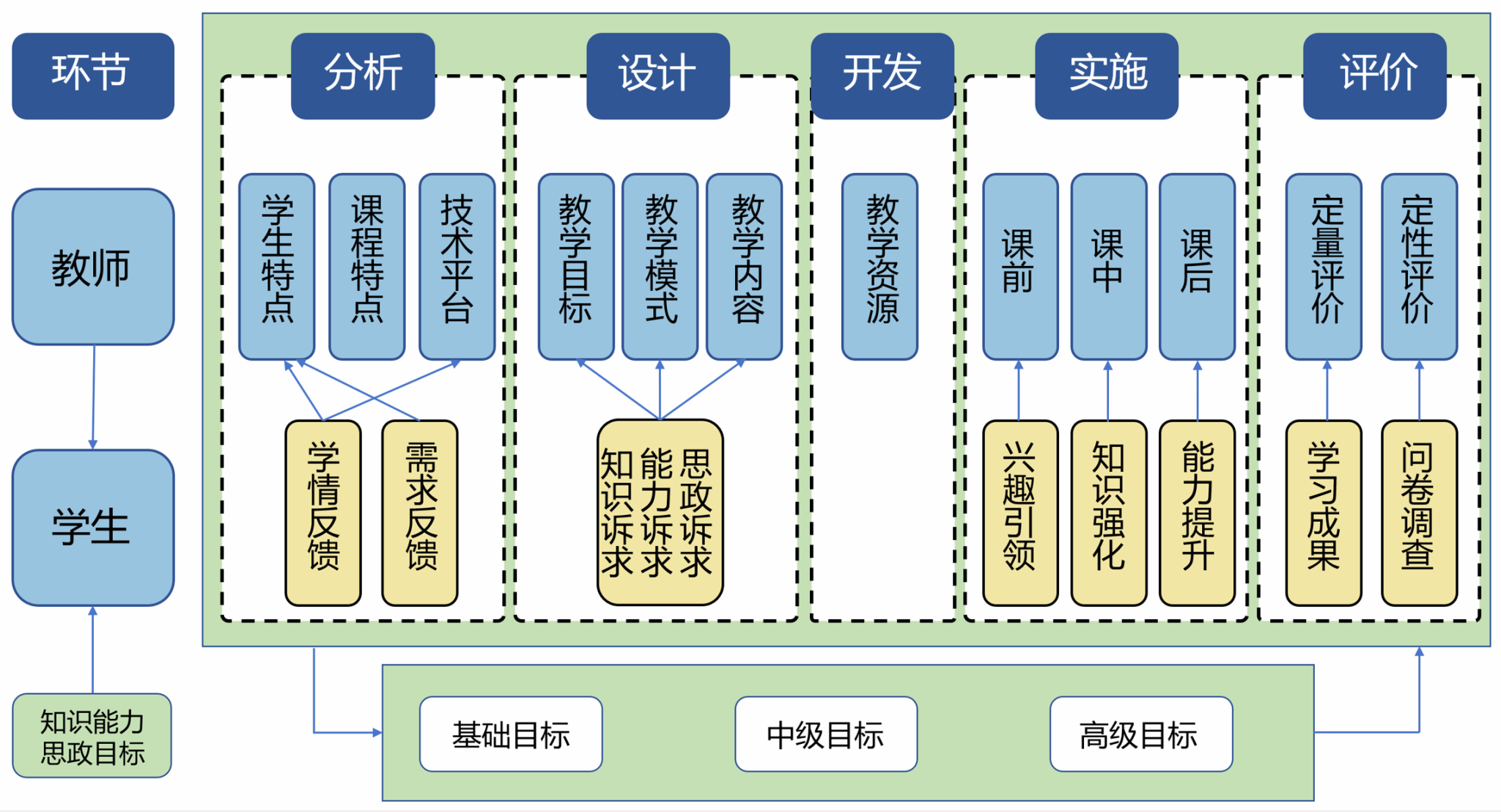 课程秉持“德育引领、学生中心、产教融合、持续改进”的教育理念,基于“建构性教学观”,构建师生学习共同体,强调师生互动、教学相长、协同创新、合作共赢,持续提高教学质量。将学生的学习由“第一课堂”有效延伸到“第二、三课堂”,打造线上线下、课内课外深度融合的混合式教学模式。为此,基于布鲁姆的教学目标分类,设计并实施ADDIE教学模式。这一模式通过系统的分析、设计、开发、实施和评价,能确保教学活动能够精准对接学生的认知需求,同时充分利用信息技术的优势,体现“以学生为中心”的教学初心。