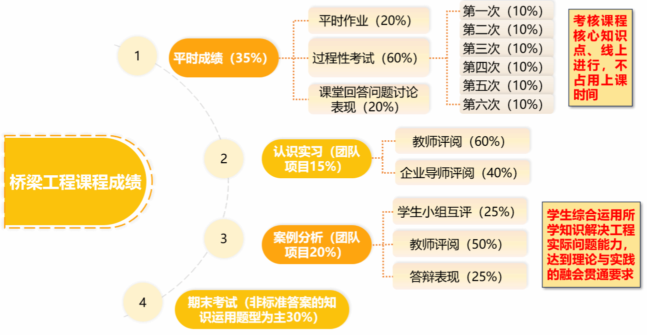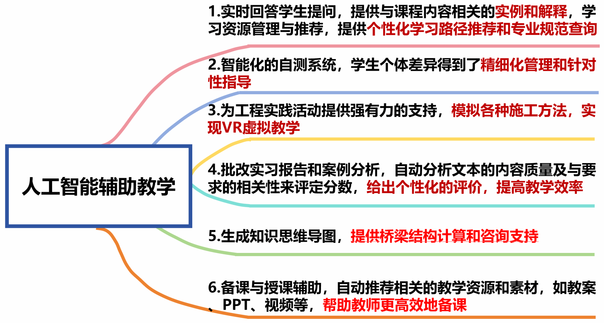 出版了以OBE为学习导向的课程教材,录制了64个核心知识点的微课视频,收集了伟大工程、走近科学等32个经典线上教学视频,建立了20个工程案例分析题库和7个思政案例库(范、傲、鉴、警、准、新、桥梁红色基因库),采用了中国大学慕课线上资源(西南交通大学 李亚东),并引入了CivilGPT模型,deepseek、豆包等人工智能模型。
