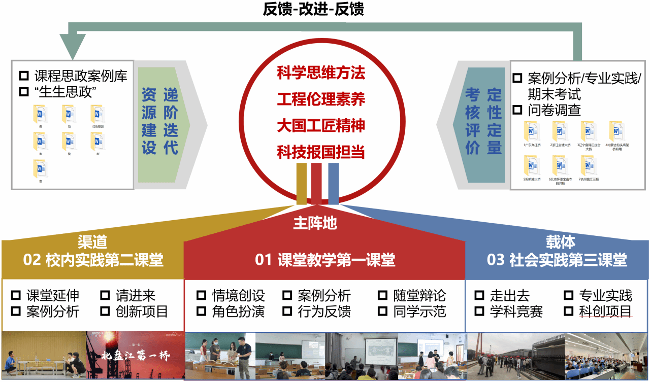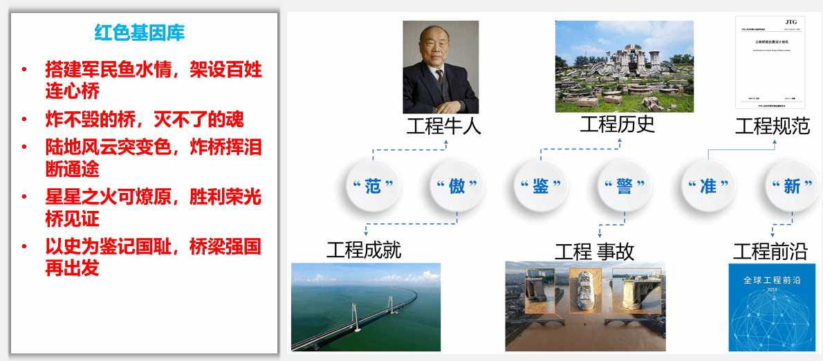 建立了基于OBE的教学设计和7个课程思政案例库(“范”、“傲”、“鉴”、“警”、“准”、“新”)和桥梁红色基因库(着眼于挖掘和运用桥梁所蕴含的红色资源铸魂育人,分成5个模块,选取了具有代表性的32座桥梁),创新性的提出了三堂联动思政育人模式。