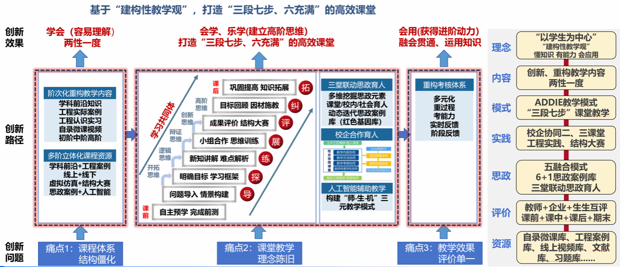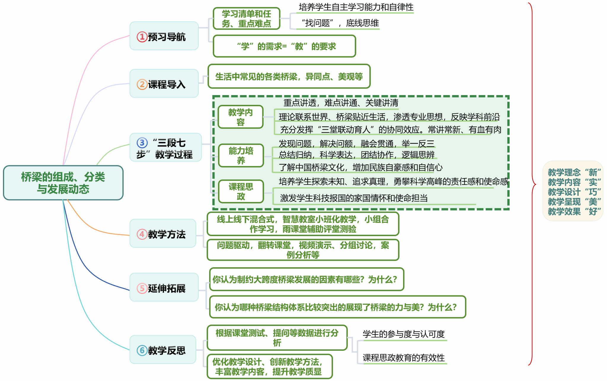 基于“建构性教学观”,创设问题情境、组织探究活动,引导学生主动参与、自主探究、逻辑推理、归纳总结,提出并实施了“三段七步”教学方法,实现45分钟课堂革命,生动导入情境激发兴趣、巧妙设置问题激发智慧、创造教学氛围激发互动、导入工程案例激发挑战、创新教学方法激发激情、引入课程思政激发温度,打造“六充满”的高效课堂,并持续改进。图片为以桥梁的组成、分类与发展动态章节为例展示教学过程。
