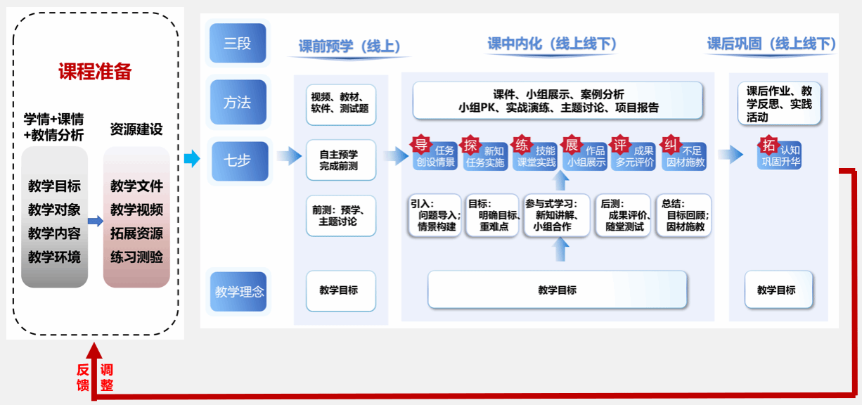基于学情、课情和教情分析,课程采用OBE教学理念与建构性教学观,运用ADDIE模式,充分利用MOOC、人工智能、实践基地、微课视频等丰富的教学资源,营造自主、合作、探究式学习环境,提出并实施了“三段七步”的教学方法,实现线上线下、课内课外互联互通,反映学科前沿,同时融合课程思政、课外知识拓展、强化创新能力,打造以“六充满”(趣味、激情、互动、智慧、挑战、温度)为特色的高效课堂,提高课程的高阶性、创新性和挑战度,实现课堂革命。开展多元化评价,引导学生主动“思考、讨论、质疑、实践、探索、悟道”,提高教学的有效性,实现知识探究、能力培养、价值塑造三位一体的培养目标。