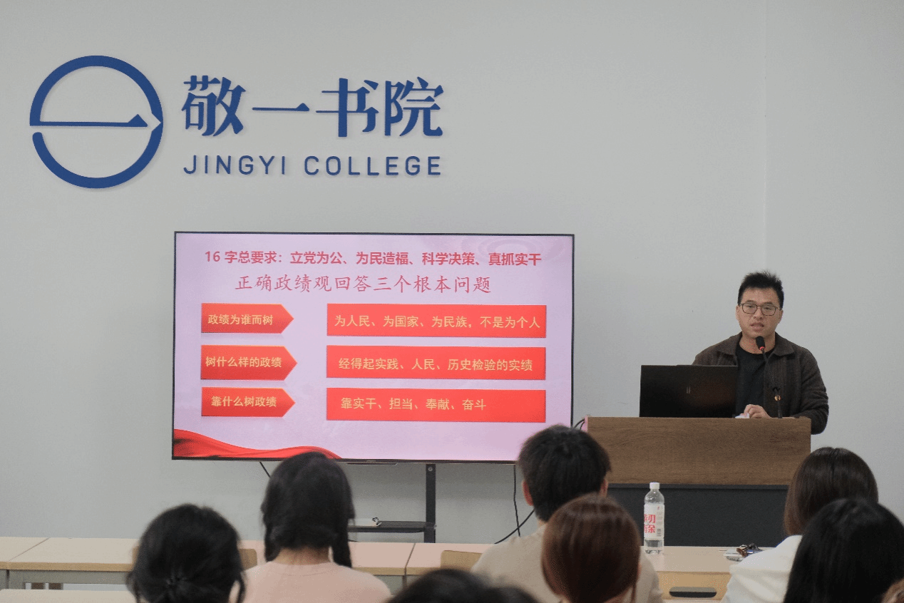 工学院团委负责人兼敬一书院办公室负责人张凯梁以《不务虚名,但求实绩》为题作专题报告。他剖析虚假政绩的“六副面孔”,希望学员把“潜绩”做成“显绩”、把“虚功”做成“实效”、把“一时”干成“一贯”,以“功成不必在我,功成必定有我”的历史担当做好学生工作。