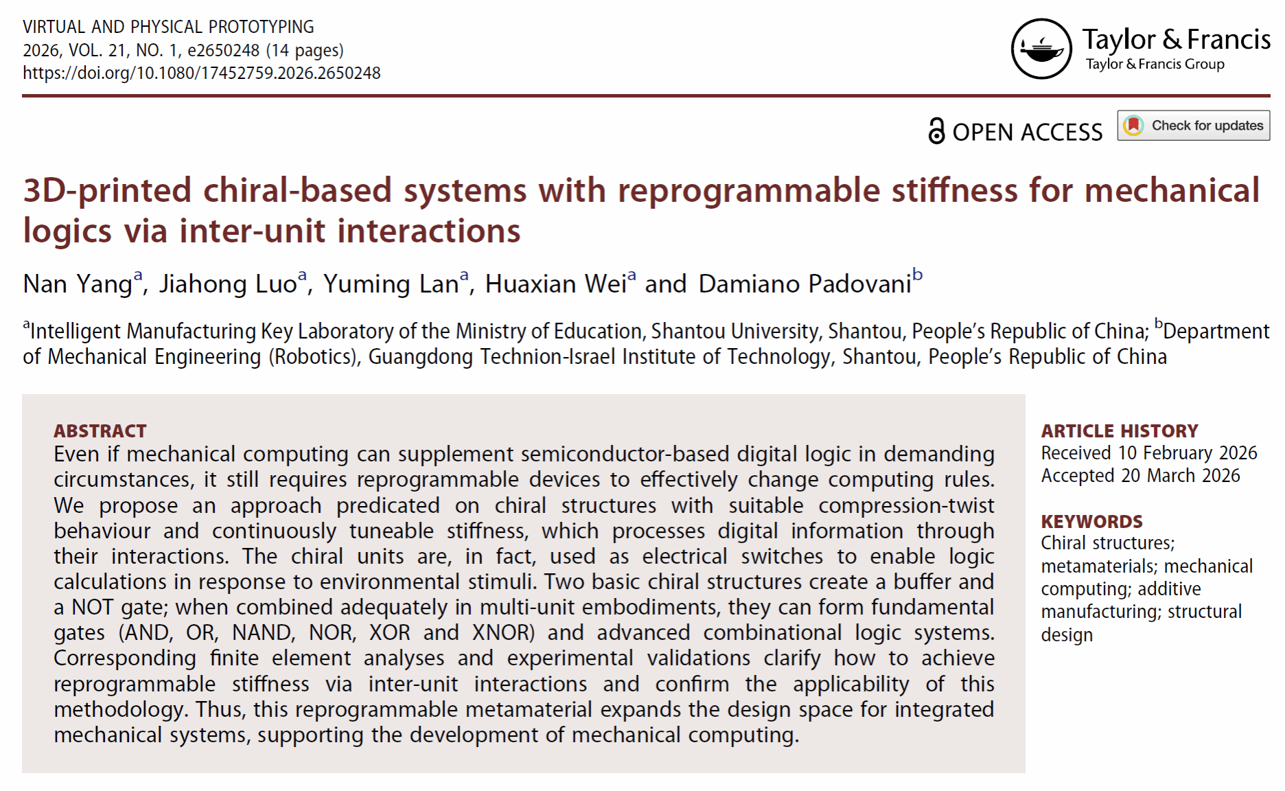 近日,汕头大学智能制造技术教育部重点实验室杨楠教授团队的研究成果《3D-printed chiral-based systems with reprogrammable stiffness for mechanical logics via inter-unit interactions》在中科院一区期刊Virtual and Physical Prototyping发表,该研究在机械计算领域取得重要突破,更值得一提的是,2023级卓越工程师班本科生罗嘉鸿和硕士生蓝宇明深度参与了此次研究的核心环节,成为科研创新的重要力量。