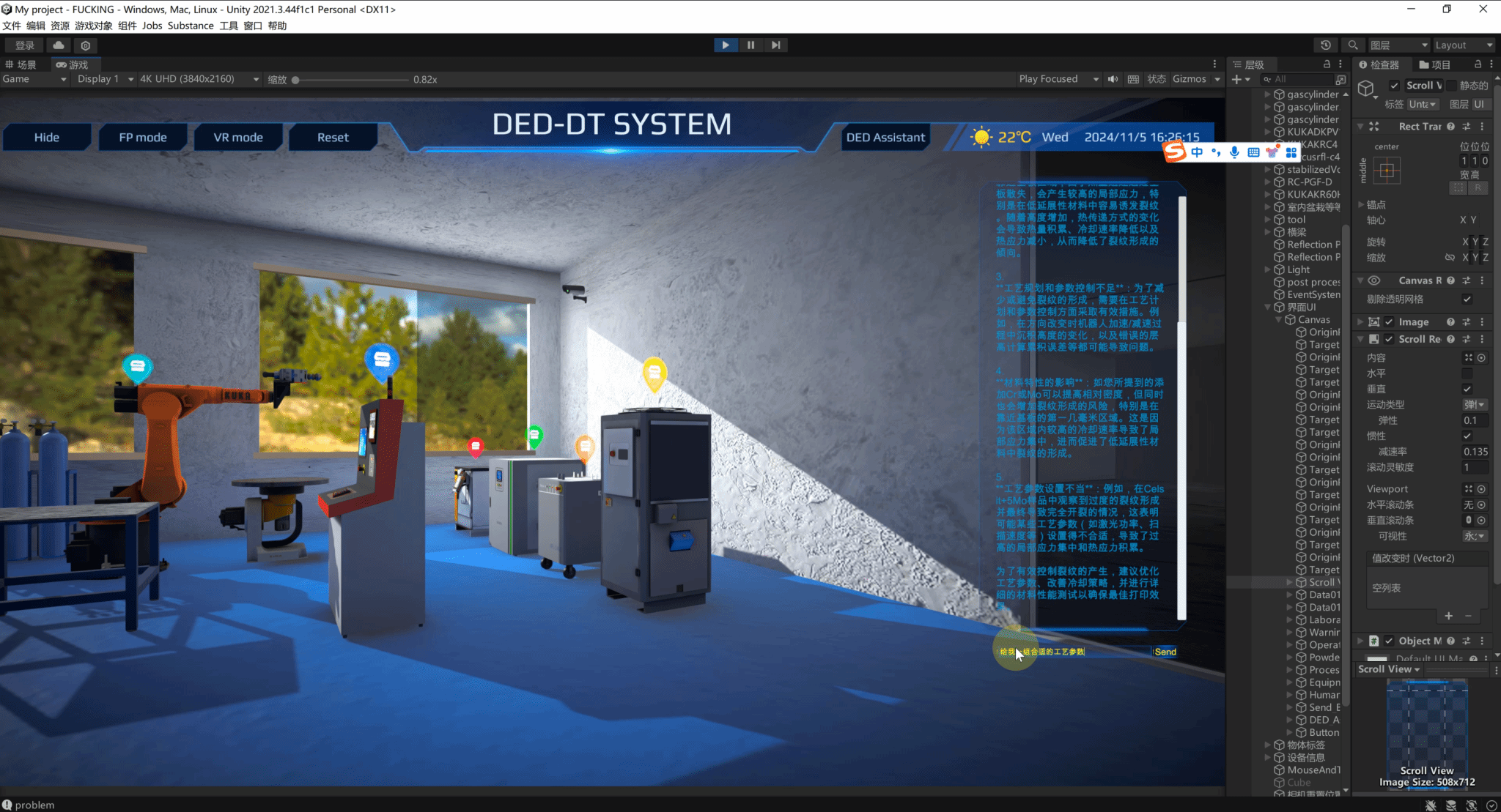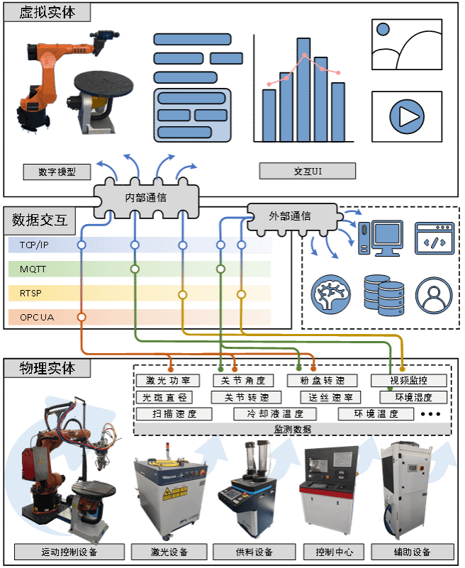 针对上述瓶颈,团队将DT与LLM融合,构建了一套面向L-DED设备的双驱动智能运维系统。研究首先建立了与物理实体实时同步的虚拟孪生体,如图3所示,包含三维数字模型、交互式监控面板及多协议通信模块,不仅整合了视频监控流,还实现了机器人关节角度、激光功率、送粉速率等关键参数的在线映射,使用户能够远程掌握现场实际工况。