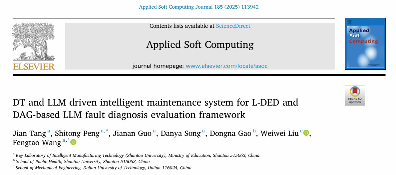 Tang J, Wang F T, Guo J N, et al. DT and LLM driven intelligent maintenance system for L-DED and DAG-based LLM fault diagnosis evaluation framework[J]. Applied Soft Computing, 2025, 185: 113942. DOI: 10.1016/j.asoc.2025.113942