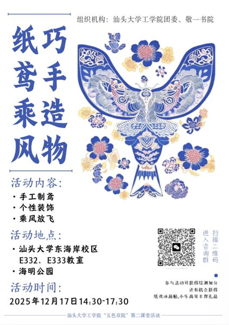 为传承中华优秀传统技艺,以非遗纸鸢文化融合工科创新教育,切实增强工科生文化感知力、实践创造力与团队协作力,深化工匠精神培育,推进“五色双院”建设,工学院、敬一书院将组织开展“巧手造物·纸鸢乘风”主题活动。具体通知如下: